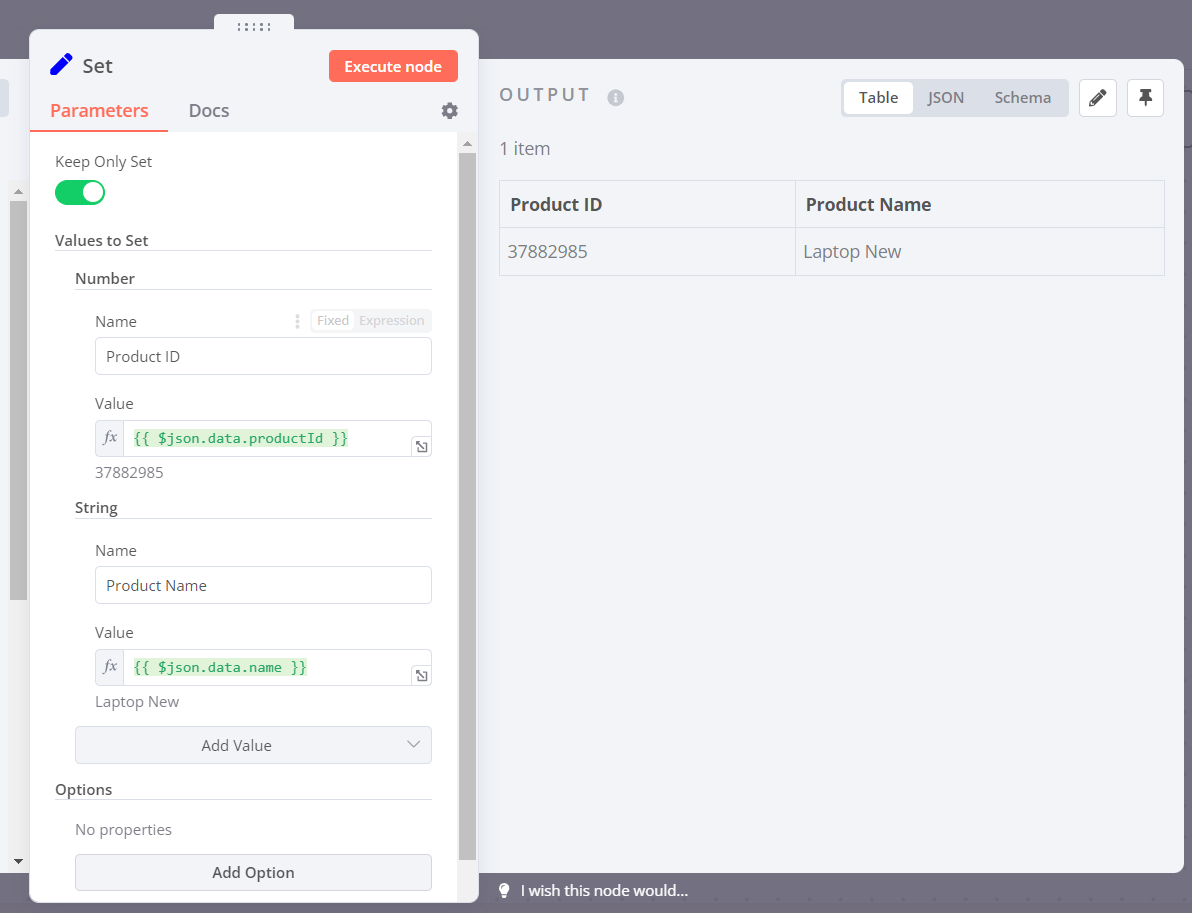 true. Chúng tôi đặt tùy chọn này thành true để đảm bảo rằng chỉ dữ liệu mà chúng tôi đã đặt trongnode này mới được chuyển sang các node tiếp theo trong quy trình làm việc.Nhấp vào Execute Node để chạy node.