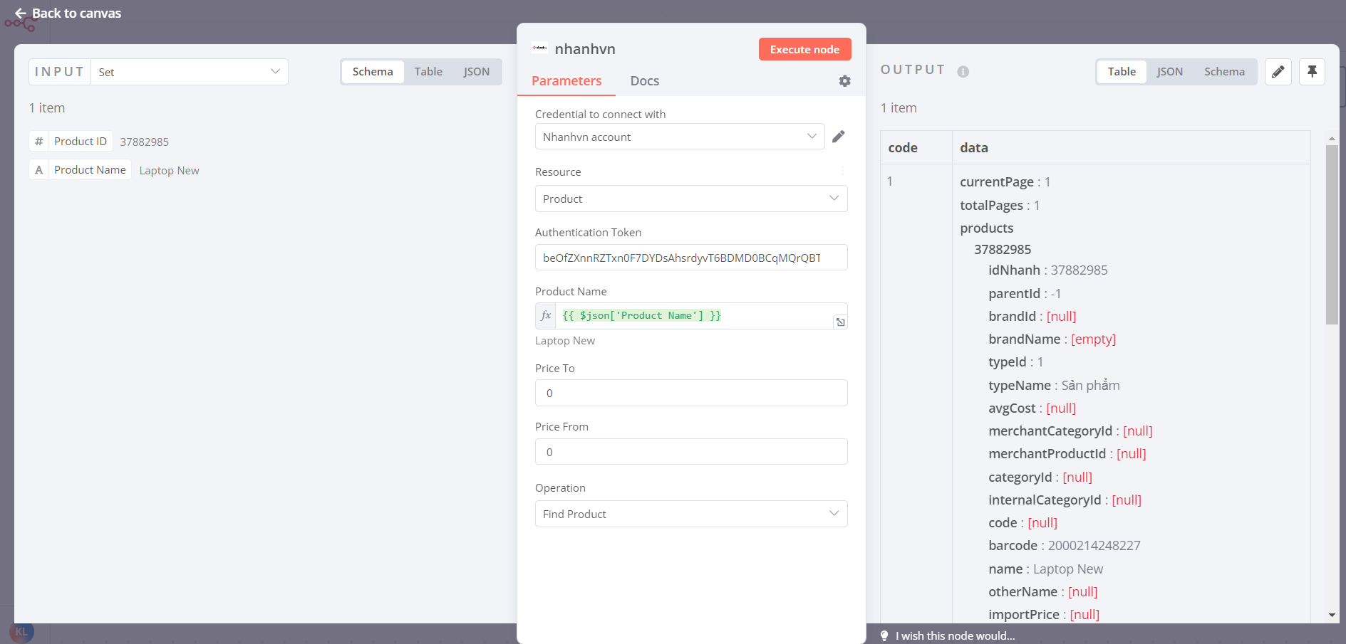 Trong ảnh chụp màn hình bên dưới, bạn sẽ nhận thấy node tìm thấy thông tin của sản phẩm mới theo giá trị tên sản phẩm của node trước đó.