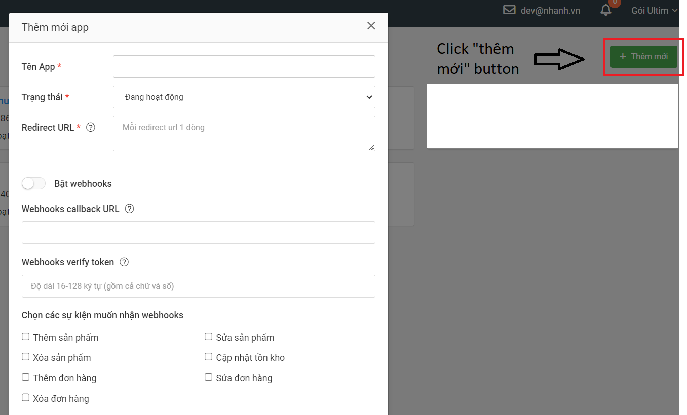 2.1 Nếu bạn chưa có ứng dụng, hãy nhấp vào nút "Thêm mới" để tạo ứng dụng