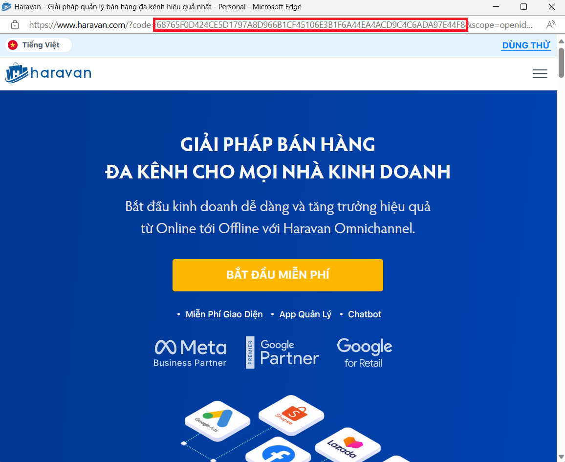 Sau khi nhαΊ₯n nΓΊt "YES", trΓ¬nh duyα»t sαΊ½ chuyα»n hΖ°α»ng ΔαΊΏn URI chuyα»n hΖ°α»ng Δược ΔΓnh kΓ¨m vα»i code cα»§a bαΊ‘n. Code cα»§a bαΊ‘n lΓ chuα»i sau xΓ’u chuα»i "code=". Haravan sαΊ½ redirect ngược lαΊ‘i vα» Allowed redirection URL kΓ¨m theo Code. VD: nαΊΏu Allowed redirection URL = https://www.haravan.com/ thΓ¬ Haravan API sαΊ½ redirect ngược lαΊ‘i vα» link https://www.haravan.com/?code=
