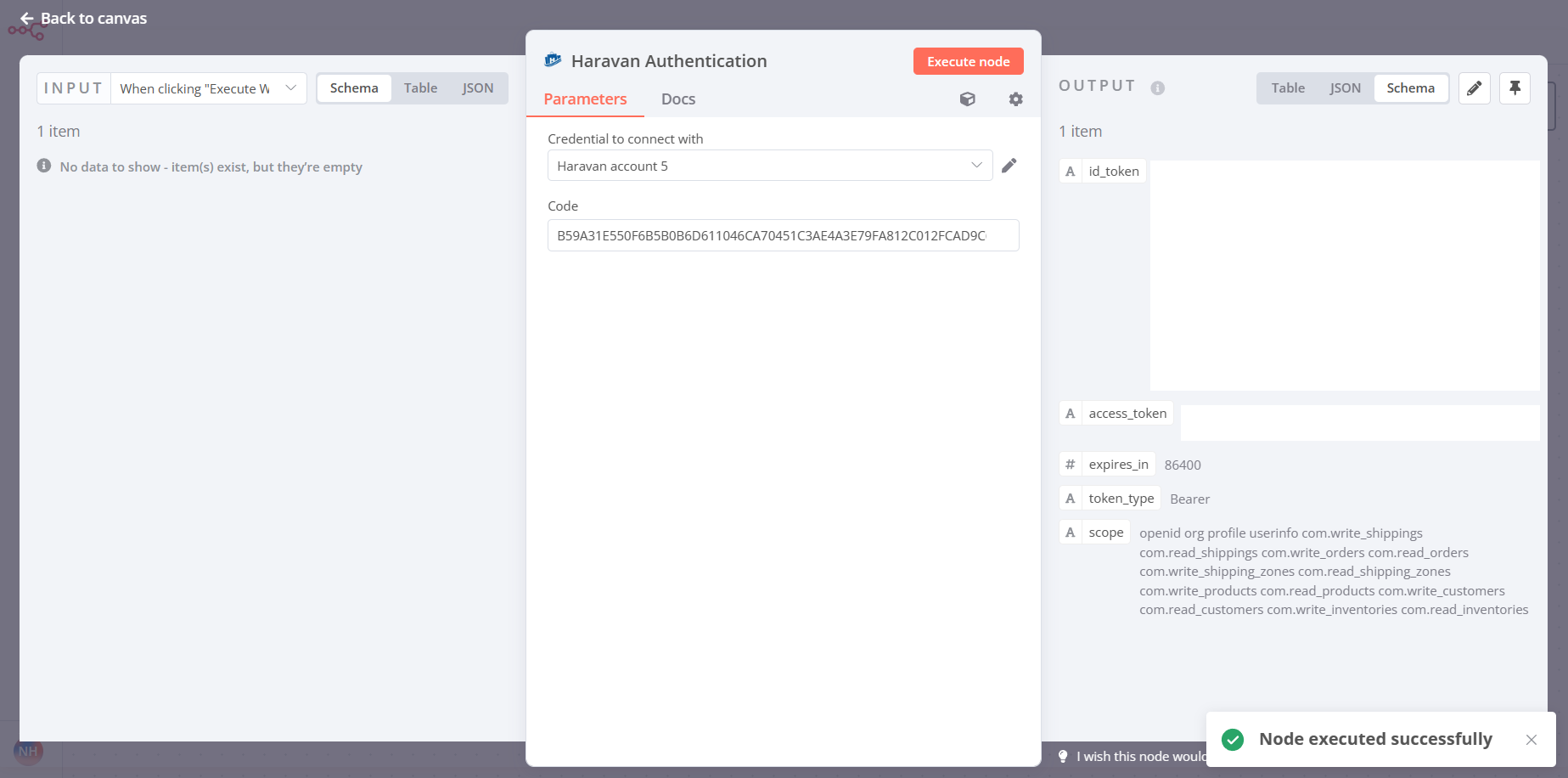 Cuα»i cΓΉng, bαΊ‘n click vΓ o nΓΊt Execute node Δα» chαΊ‘y Haravan node thα»±c thi Retrieves a List of Refunds for an Order action.