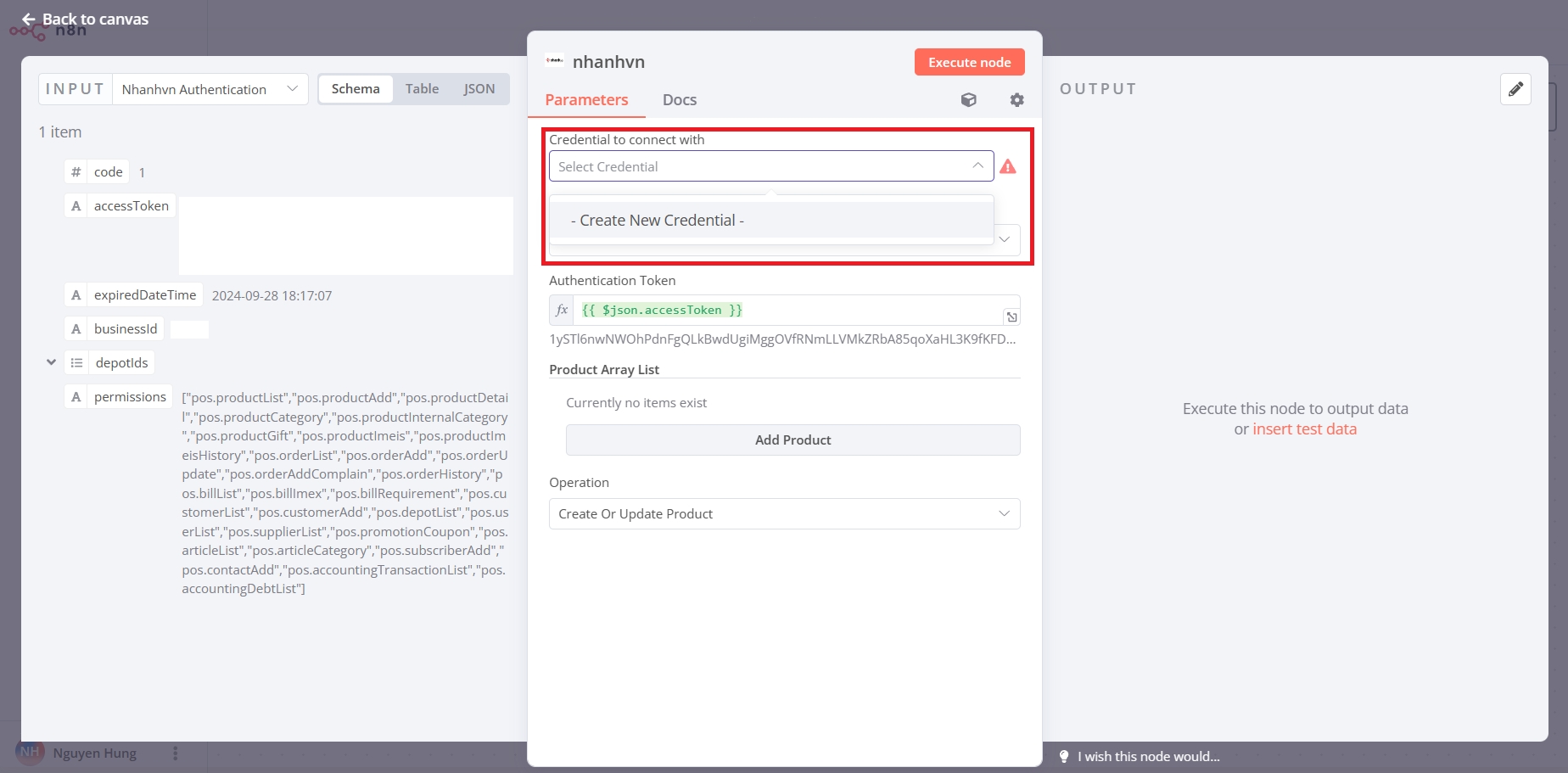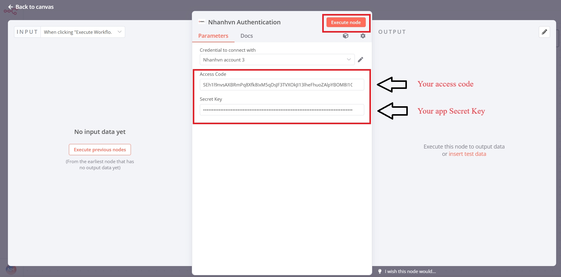 Tiếp theo, bạn cung cấp access code lấy ở bước trên và Serect Key trong ứng dụng của bạn vào các trường nhập tương ứng trong Nhanhvn Authentication. Sau đó, bạn sẽ click nút Execute node để lấy access Token.