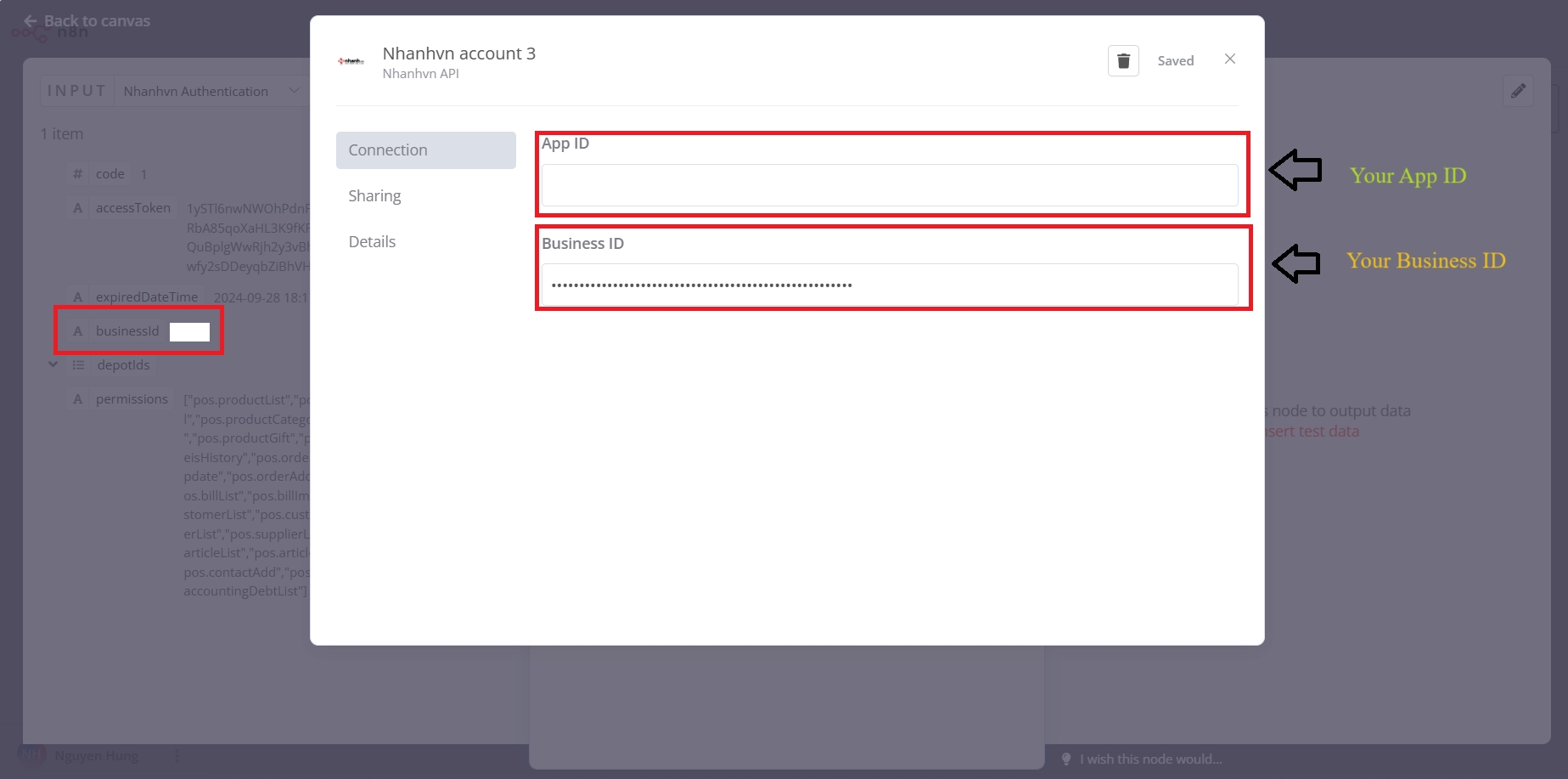 Cung cấp App ID trong app của bạn và Business ID (note: Business ID is the result of the previous node). After that, you can click save to finish creating credentials.