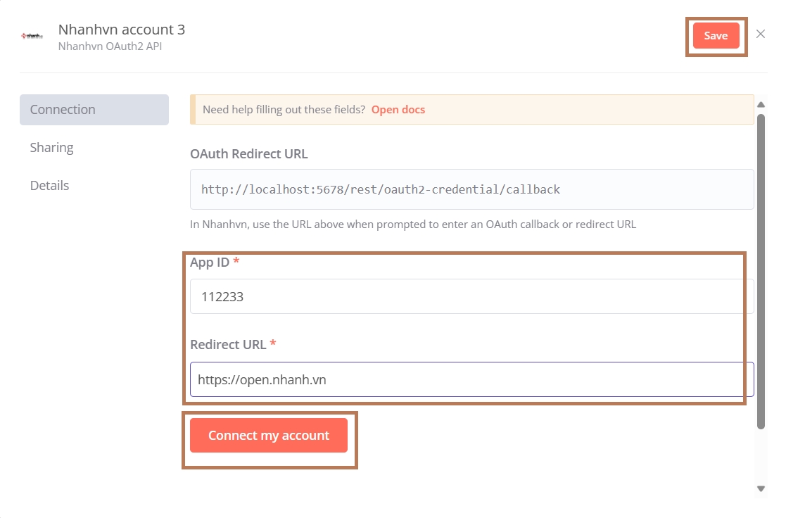 Để sử dụng Nhanhvn Authentication node, đăng ký tài khoản nhà phát triển và tạo ứng dụng tại https://open.nhanh.vn/. Hướng dẫn có sẵn tại https://apidocs.nhanh.vn/#khoi-tao-ung-dung.