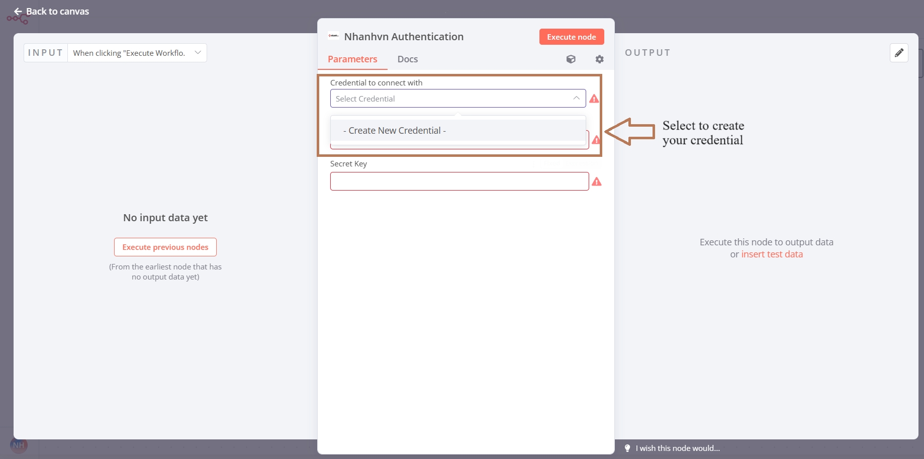 Bạn sẽ sử dụng Nhanhvn Authentication node để nhận được access token để sử dụng cho các action khác nhau trong Nhanhvn node. Trước đó, bạn phải create new credentials để lấy access code.