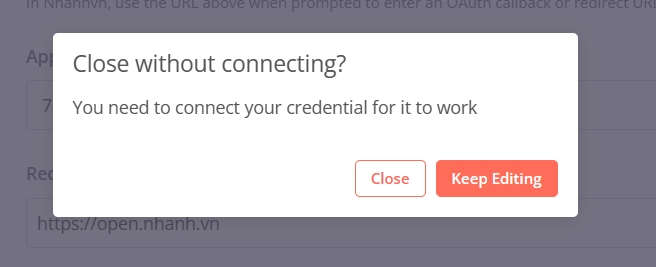 Sau khi lấy được access code bạn đóng Access Code window và trở về credential screen. Ngay lúc này bạn tắt nó và chỉ cần bấm đóng khi Close without connecting popup xuất hiện vì Nhanhvn không có Authorization server support OAuth 2.0 protocol. Điều này sẽ không ảnh hưởng đến các quá trình tiếp theo.